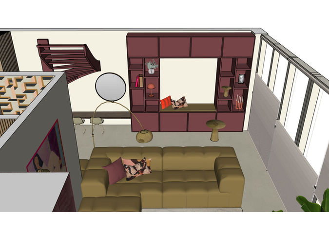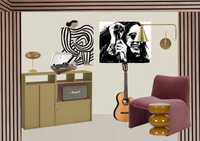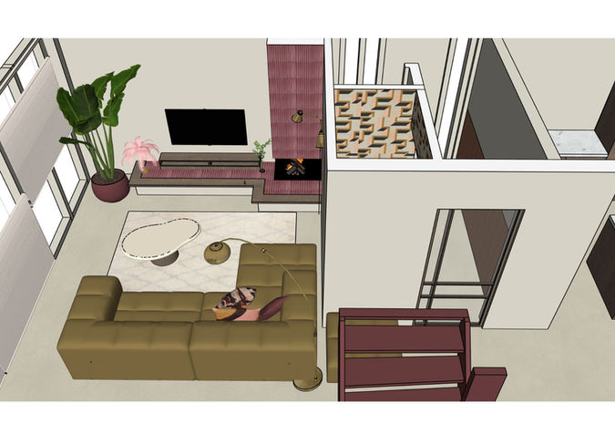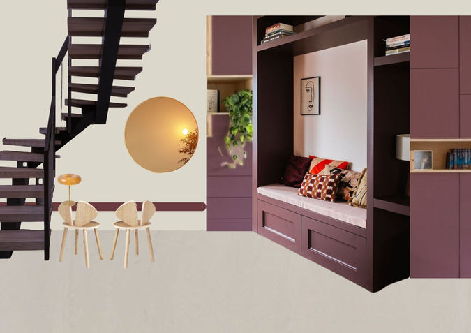 Het plan dat daaruit kwam, is een warme, persoonlijke mix: diepe tinten zoals Merlot Mania van LAB Paint, een fijne plek voor Merijn om muziek te maken en te luisteren, een plofbank in goud/groen voor Roselie, en een opvallende haard met kitkattegels in de trendkleur ‘berry’.